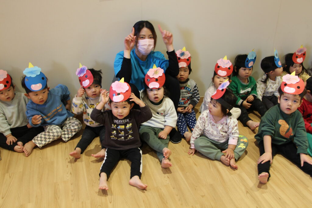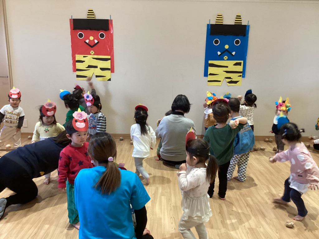 年長さんが自分で作った服やお面、金棒で元気よく鬼役をやってくれました。